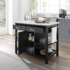 Compact Black Wood And Stainless Steel Portable Kitchen Island – N/A – Kitchen Cart – Wood – Black