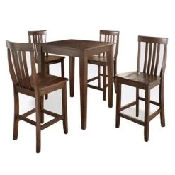 Upgrade your dining experience with the 5Pc Pub Dining Set featuring School House Stools. This set is perfect for intimate dinners or casual gatherings in a game room. The square tabletop provides ample space for meals, drinks and board games, while the slat back stools offer comfortable seating for extended periods. This set is designed to add both function and style to any room, making it a great addition to your kitchen, dining area or basement. Crafted with a mahogany finish and tapered legs, this transitional set pairs well with traditional, rustic and modern farmhouse décor.