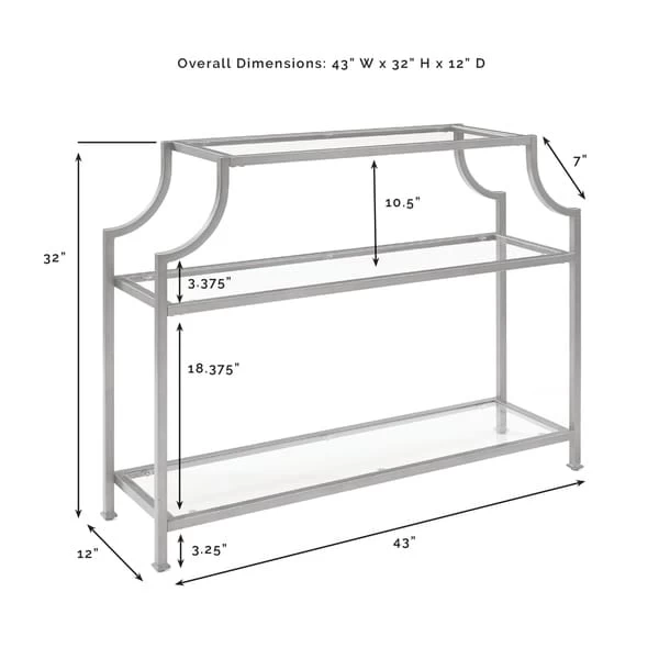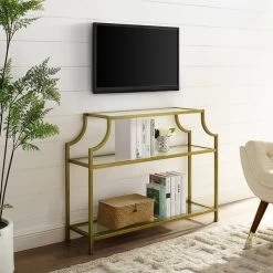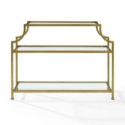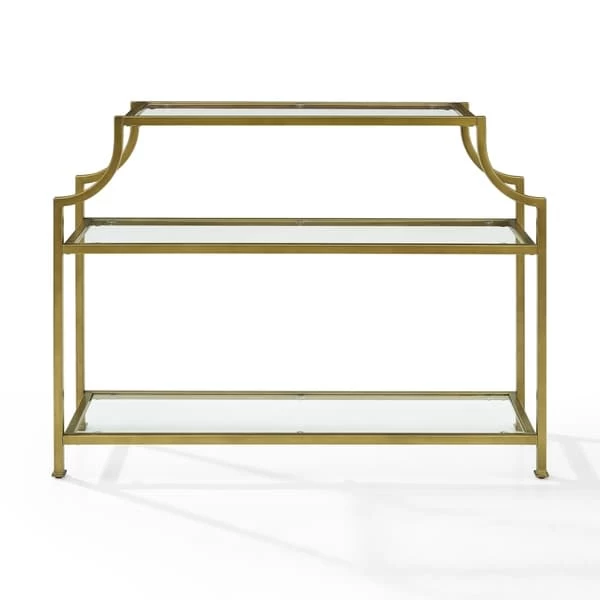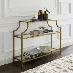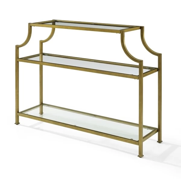 Add retro charm to your space with this mid-century inspired console table. The powder-coated steel frame with an antiqued gold finish supports the durable, tempered glass tabletop and lower shelves, providing ample space for your decor.