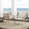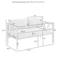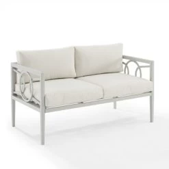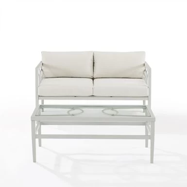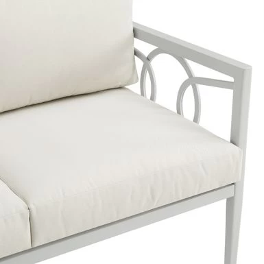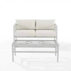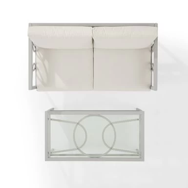 Create an outdoor oasis with the Ashford 2Pc Conversation Set. This modern and stylish set features a powder-coated steel frame with interlocking circle accents, along with creme cushion covers and a tempered glass tabletop. Perfect for seating two people, the set is weather-resistant and includes high-performance solution-dyed polyester cushion covers to resist mildew, sun fade, and abrasion. The loveseat dimensions are 67″W x 52″D x 31.5″H and the coffee table is 43.25″W x 21.5″D x 16.5″H.