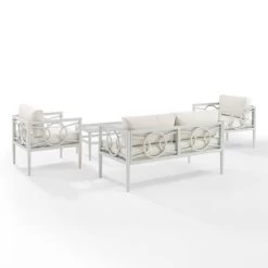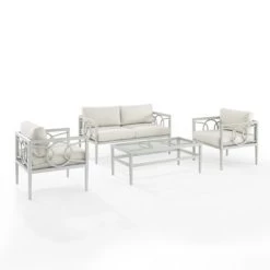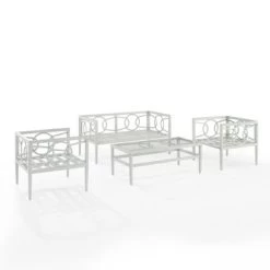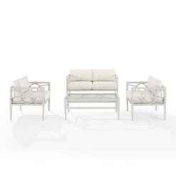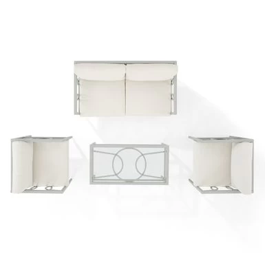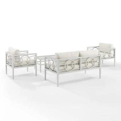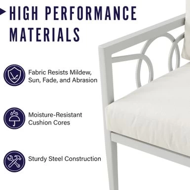 The Ashford 4Pc Outdoor Metal Conversation Set is sure to bring an upscale vibe to your outdoor oasis. Crafted from powder-coated steel, this weather-resistant set includes a loveseat, two armchairs, and a tempered glass tabletop with interlocking circle accents. The high-performance polyester cushion covers are mildew- and sun-fade-resistant, while the cushion cores are moisture-resistant. The set comfortably seats up to four and its elegant design will last for years to come.