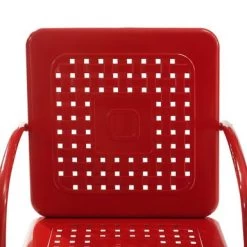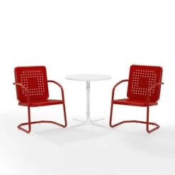 Nostalgia abounds with the Bates 3pc Bistro Set. Two vintage-style chairs in vibrant colors surround a simple metal bistro table for a fun and functional outdoor lounging experience. Nostalgia abounds with the Bates 3pc Bistro Set. Two vintage-style chairs in vibrant colors surround a simple metal bistro table for a fun and functional outdoor lounging experience. Each chair features a square back with a unique basket weave design that allows air to circulate. With a cantilever design, the chairs offer a comfortable seat for outdoor relaxation. The table’s sturdy pedestal base is comprised of four metal legs and easily tucks between the chairs, making the Bates 3pc Bistro Set ideal for a small balcony or patio. –