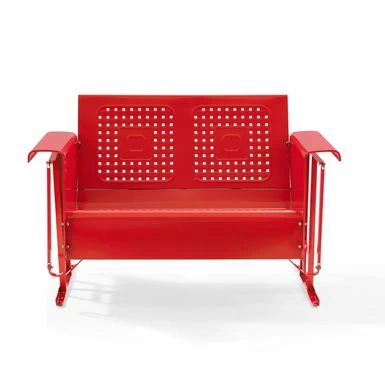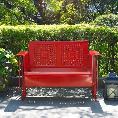 Make your outdoor space come alive with the Bates Loveseat Glider in Red. With its powder-coated steel frame, weather-resistant properties, and gliding base, this loveseat is perfect for unwinding after a long day. Its squared armrests and cut-out woven design offer both style and comfort, while its vintage touch gives your space a retro vibe. This glider seats up to two people, making it ideal for lounging with a loved one. Assembly is required.