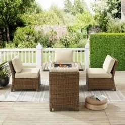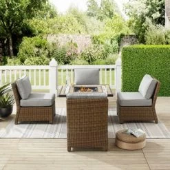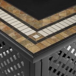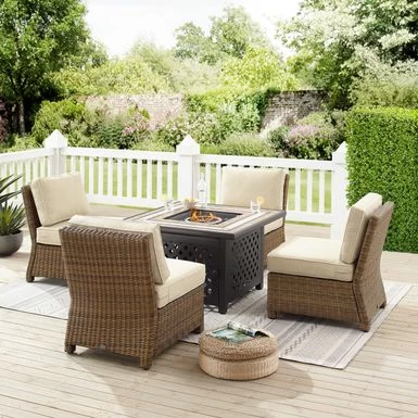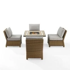 Cozy up around the fire with the Bradenton 5pc Outdoor Wicker Conversation Set, featuring four armless chairs and a powder-coated steel fire table. Enjoy the unique design of the tiled stone top and lattice panel base, while keeping propane tank and gas controls conveniently stored inside. The high-performance solution-dyed polyester cushion covers resist mildew, sun fade, and abrasion, ensuring long-lasting durability and comfort. The set also includes 10lbs of black glass fire beads and protective covers for the table and propane tank (Propane tank not included).
