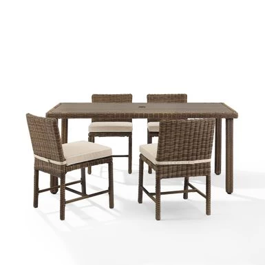 Get the perfect outdoor dining experience with the Bradenton 5Pc Outdoor Wicker Dining Set. This set includes four chairs and one rectangular table with a durable top, all crafted with steel frames wrapped in all-weather wicker. The table features a standard umbrella hole, so your guests can stay shaded and comfortable. Plus, the cushion covers are UV-resistant, mildew-resistant, and fade-resistant, making sure that the set stays looking great for years to come.