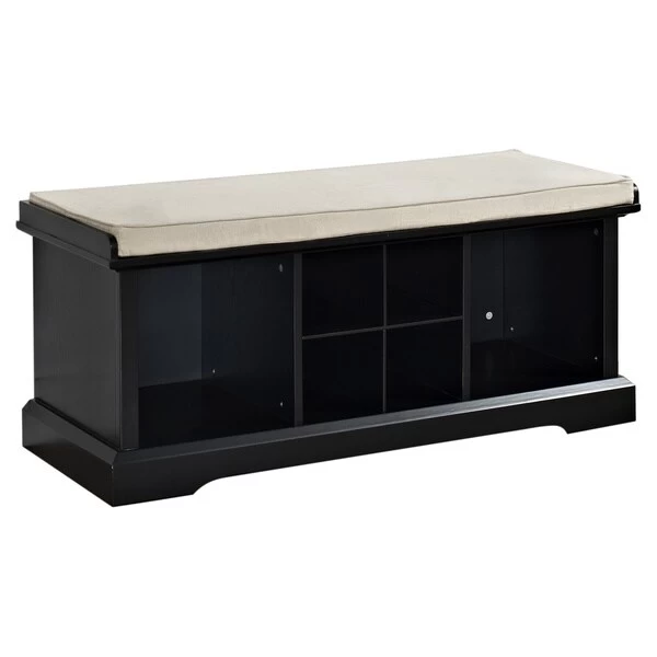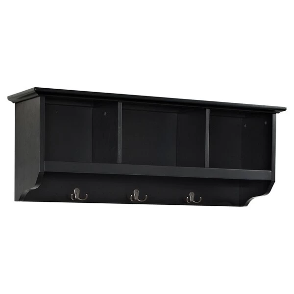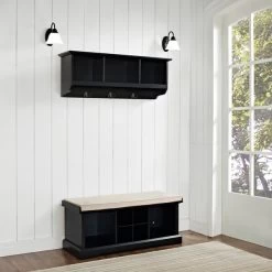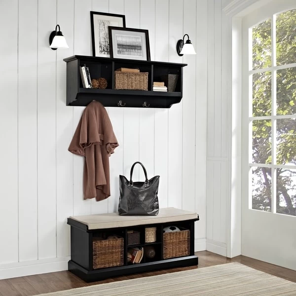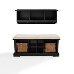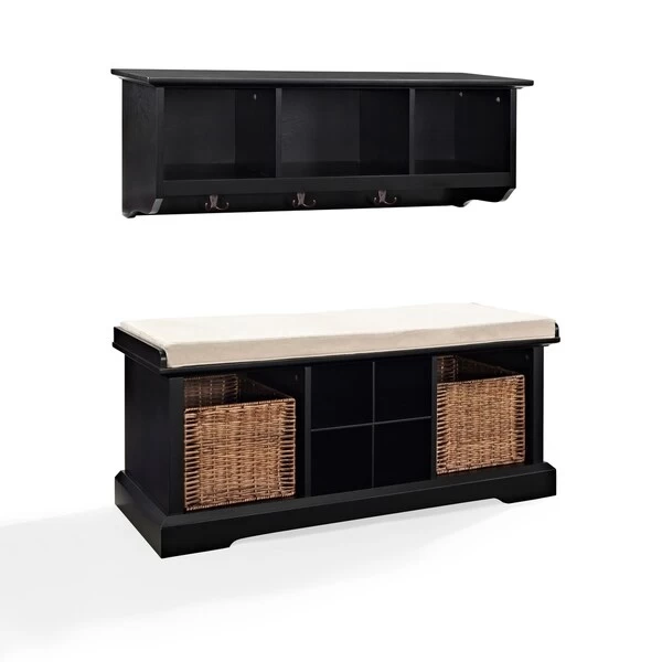 Organize your entryway with a sophisticated bench set that’s built to last. This cubby bench has several slots for storing shoes and other small items, and also makes for a comfortable seat. Included baskets allow for storage of scarves, gloves, and hats while adding a beautiful touch to your entryway. The matching wall unit features open shelves for storing hats and the like. Four hooks are perfect for hanging a family of coats and jackets.Â