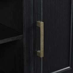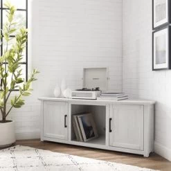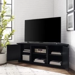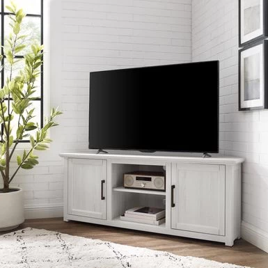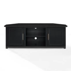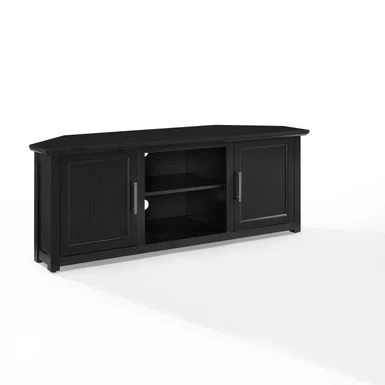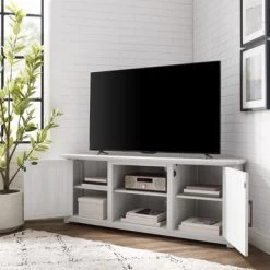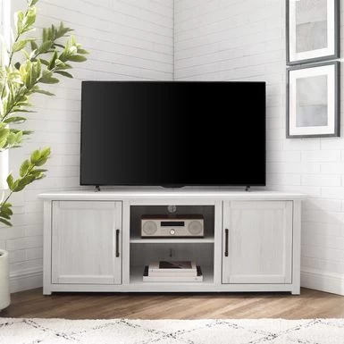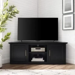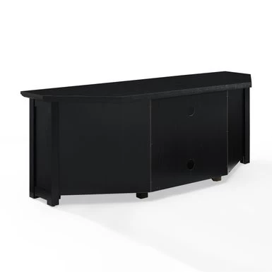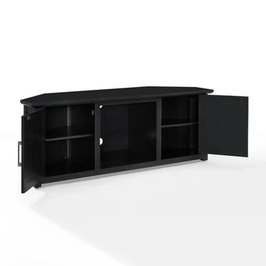 Perfect for smaller living spaces, this corner TV console tucks neatly into any corner. Showing off two cabinets with an adjustable shelf in each, this stand is ready to corral your messes, as its open storage in the center offers an adjustable, removable shelf with two pre-cut holes in the back for cable management.