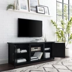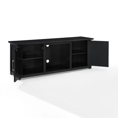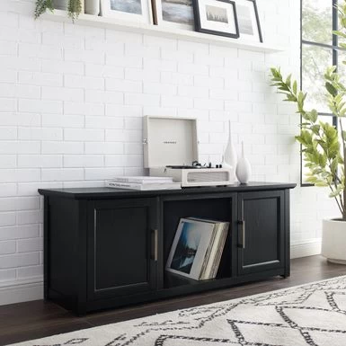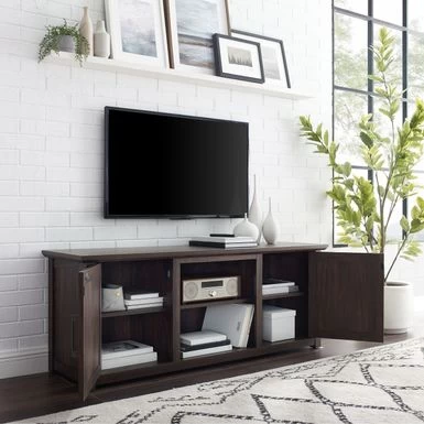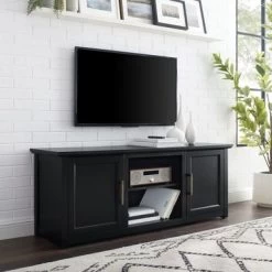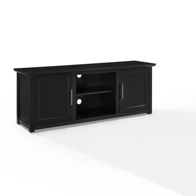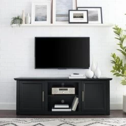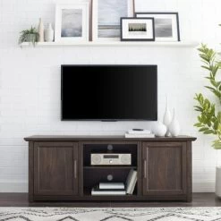 Upgrade your home entertainment with the Camden 58-inch low profile TV stand. Featuring a sleek design and available in four finishes, this stand offers ample storage with two cabinets and adjustable shelves, as well as open storage with removable and adjustable shelf. The pre-cut holes in the back provide easy cable management. Perfect for TVs up to 60 inches.