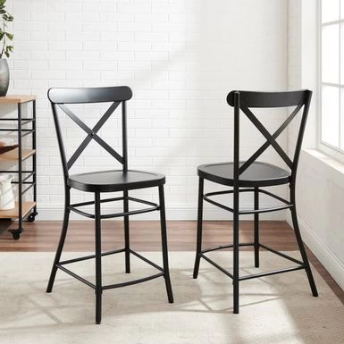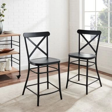 Bring a touch of classic French industrial design to your kitchen or dining room with the Camille 2Pc Metal Counter Stool Set. With its sleek and sturdy silhouette, this set is constructed of solid steel and features a stylish x-back design in a matte black finish. Perfect for extra seating around your counter-height tables and kitchen islands, these stools pair well with both rustic and modern farmhouse decor.