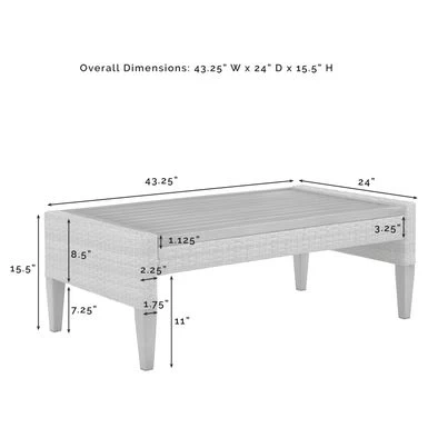- Coffee Table Dimensions: 15.5″H x 43.25″W x 24″D