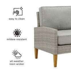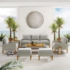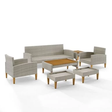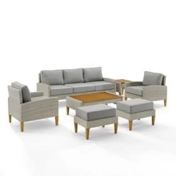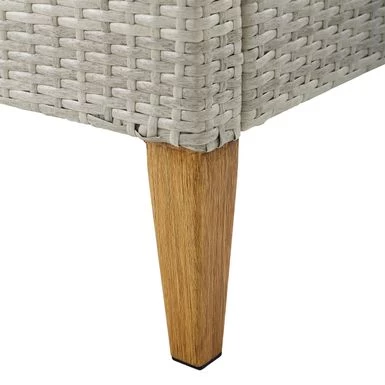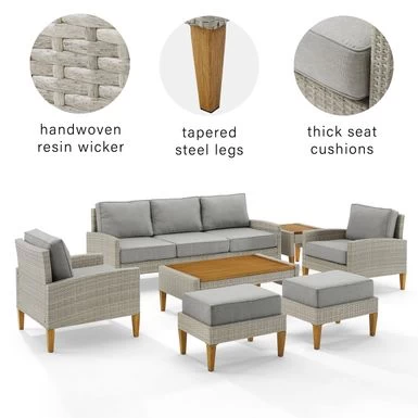 Enjoy quality time outdoors with the Capella 7Pc Outdoor Wicker Sofa Set. This stylish set blends neutral tones with natural finishes, featuring all-weather resin wicker and hand-painted steel with a teak look. Durable quick-drying olefin fabric lines the cushioned seating and ottomans, while the slatted steel tops of the coffee and side tables are perfect for drinks. With a cool coastal vibe, the Capella 7Pc Set is perfect for your patio or deck.