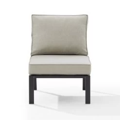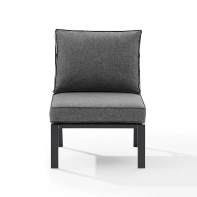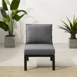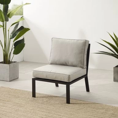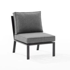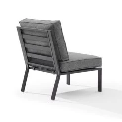 Enjoy the warmth of the morning sun in style with the Clark Outdoor Metal Sectional Center Chair. Crafted from powder-coated steel, this modern and sleek armless chair is built to last, offering weather-resistant protection for the thick cushions. Cushion covers come in a variety of colors and are made from quick-drying olefin fabric that resists mildew, sun fade, and abrasion. The 4″ thick cushions and slatted back design offer the perfect spot to relax, and the modular design allows for limitless configurations.