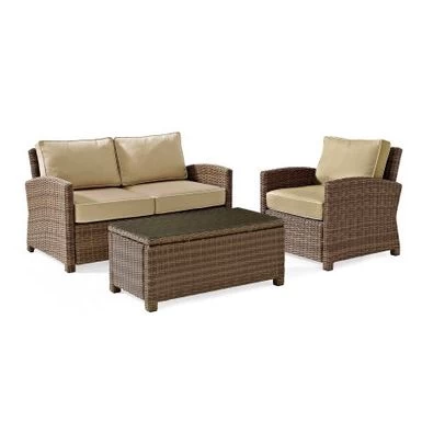 Crosley Furniture Bradenton 3 Piece Outdoor Wicker Seating Set with Navy Cushions – Loveseat, Arm Chair & Glass Top Table: