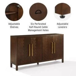 Elevate your at-home storage with the stunning style of the Darcy Sideboard. Elevate your at-home storage with the stunning style of the Darcy Sideboard. Featuring two large cabinets with adjustable shelves and punchouts for cables, this sideboard can provide traditional dining room storage or function as a media cabinet for a multi-purpose room. Each door showcases a bold herringbone pattern and oversized hardware, making the Darcy Sideboard an elegant addition to any room of your home.Features:Modern designDark brown finishGenuine metal hardware in a brushed gold finishClassic herringbone design on cabinet doorsCabinet doors have magnetic closuresTwo adjustable and removable shelves in each cabinet with a 15lb weight limit per shelfSix perforated half-round cable management holesAdjustable levelers on legsAccommodates most TV’s up to 65″Pairs well with mid-century, modern farmhouse, and glam decorSideboard top weight limit is 100lbs