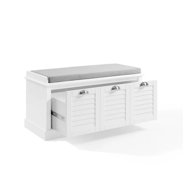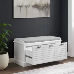 Keep your entryway organized with the Ellison Storage Bench. This coastal-inspired bench features a cushioned seat for comfortable shoe-changing, and a large storage drawer to hide away clutter. The white finish and brushed nickel hardware give it a classic yet modern look that complements traditional and modern farmhouse décor.