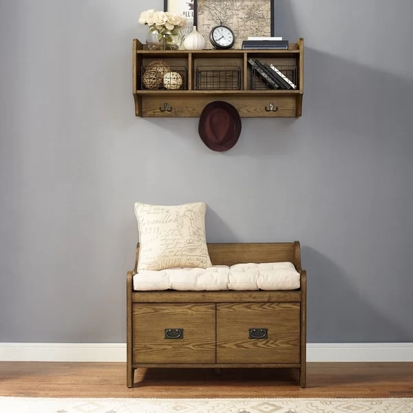 Create a tidy and welcoming entryway with the Fremont 2 Pc Entryway Kit. This kit includes a sturdy bench and a versatile shelf with three coat hooks and three wire baskets for storage. The bench features two convenient cubbies with antique hardware for easy access to your everyday essentials. Pair with other pieces from the Fremont Collection to complete your foyer’s look.