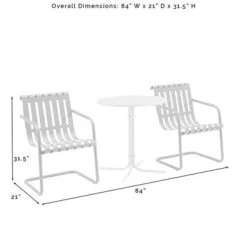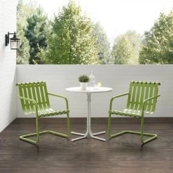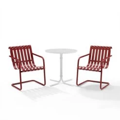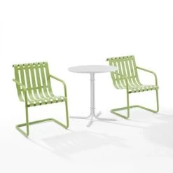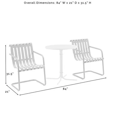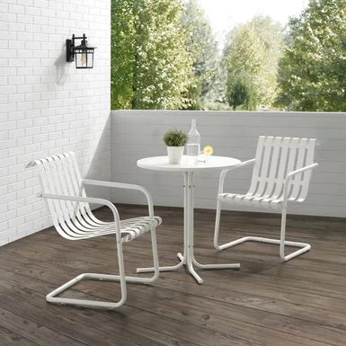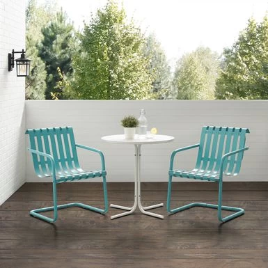 The Gracie 3pc Bistro Set combines fashion and function in a colorful retro package. This set features two slatted chairs with cantilever bases surrounding a simple pedestal bistro table. Ideal for a small balcony or patio, the Gracie bistro set will have you dining in vintage style.Â