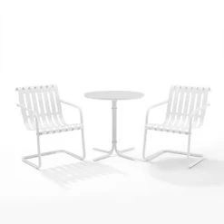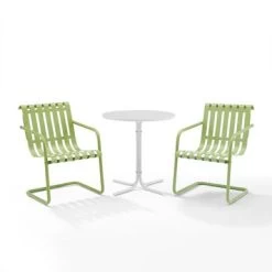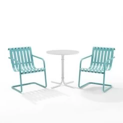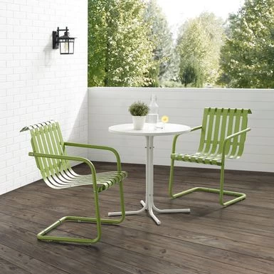 The Gracie 3pc Bistro Set combines fashion and function in a colorful retro package. This set features two slatted chairs with cantilever bases surrounding a simple pedestal bistro table. Ideal for a small balcony or patio, the Gracie bistro set will have you dining in vintage style.Â