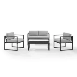 Entertain and relax outdoors with the Hamilton 4pc Conversation Set. This modern and lightweight set features a sleek silhouette and aluminum frame in a matte black finish. The gray weather-resistant cushions are made of durable solution-dyed polyester and high-grade cushion cores, perfect for small spaces.