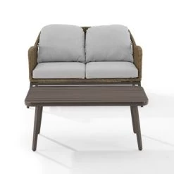 Add rustic charm to your outdoor space with the Haven 2Pc Outdoor Wicker Conversation Set. This Boho-inspired set features a durable powder-coated steel frame with synthetic twine crafted to look like natural rope, and comes with light-brown twine and light-gray cushion covers. The loveseat and coffee table boast tapered steel legs in a bronze finish and a slatted top, respectively. With weather-resistant polyester cushion covers and moisture-resistant high-grade cushion cores, the Haven Conversation Set will provide a fetching retreat from the daily grind.