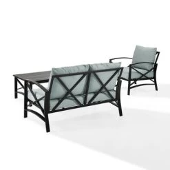 Kaplan 3 Pc Outdoor Seating Set With Mist Cushion – Loveseat, Chair , Coffee Table – 95.5″W X 66.5″D X 36″H – 95.5″W X 66.5″D X 36″H – Mist