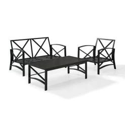 Add simple elegance to your outdoor area with the Kaplan Collection. This three-piece set is made with rust protected premium steel with an oil bronze finish. The cushions have a moisture-resistant and UV-resistant cover to protect against fading. Add simple elegance to your outdoor area with the Kaplan Collection. This three-piece set is made with rust protected premium steel with an oil bronze finish. The cushions have a moisture-resistant and UV-resistant cover to protect against fading. This set includes a loveseat, a chair, and a coffee table. It is easy to assemble and even easier to enjoy.