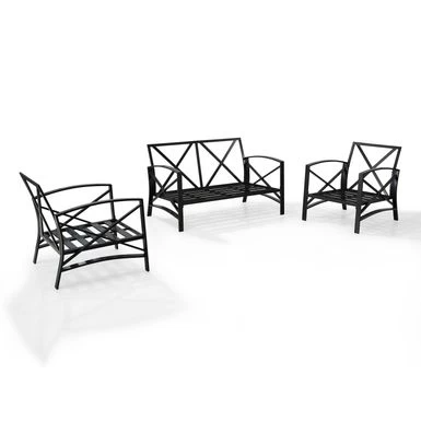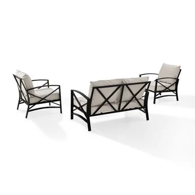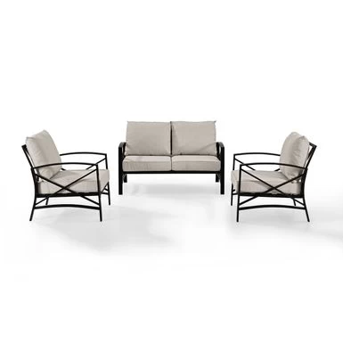 Add simple elegance to your outdoor area with the Kaplan Collection. This three-piece set is made with rust protected premium steel with an oil bronze finish. The cushions have a moisture-resistant and UV-resistant cover to protect against fading. Add simple elegance to your outdoor area with the Kaplan Collection. This three-piece set is made with rust protected premium steel with an oil bronze finish. The cushions have a moisture-resistant and UV-resistant cover to protect against fading. This set includes a loveseat and two chairs. It is easy to assemble and even easier to enjoy.