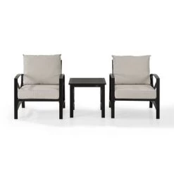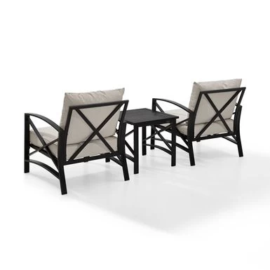 Add simple elegance to your outdoor area with the Kaplan Collection. This three-piece set is made with rust protected premium steel with an oil bronze finish. The cushions have a moisture-resistant and UV-resistant cover to protect against fading. Add simple elegance to your outdoor area with the Kaplan Collection. This three-piece set is made with rust protected premium steel with an oil bronze finish. The cushions have a moisture-resistant and UV-resistant cover to protect against fading. This set includes two chairs and a side table. It is easy to assemble and even easier to enjoy.