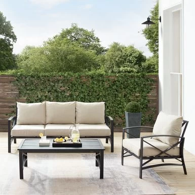 Enjoy outdoor relaxation with the Kaplan 3Pc Outdoor Sofa Set! This classic set includes a sofa, chair, and coffee table, crafted with steel frames in a transitional x-back design. The 5″ cushions on the sofa and 8″ cushions on the chair are made with moisture-resistant high-grade cores and weather-resistant solution-dyed polyester covers. The coffee table features a classic slatted look, and the removable cushion covers are also machine washable. Seats up to four.