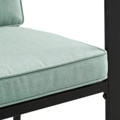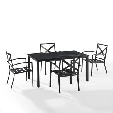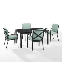 This elegant outdoor dining set from Crosley Furniture’s Kaplan collection is the perfect way to make the most of your patio space. Made of steel with an oil-rubbed bronze finish, this set is resistant to the weather for long-term use. The mist-green chair cushions complete the set with comfort and style.