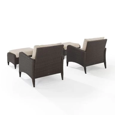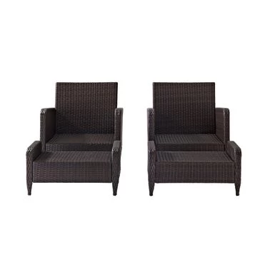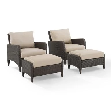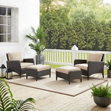 Relax and unwind with the Kiawah 4Pc Outdoor Wicker Chat Set. Enjoy deep seating and plush, piped cushions on the chairs and ottomans, with durable powder-coated steel frames covered in all-weather wicker for style and durability. Soak up some sun in style and comfort with the Kiawah 4pc Chat Set.