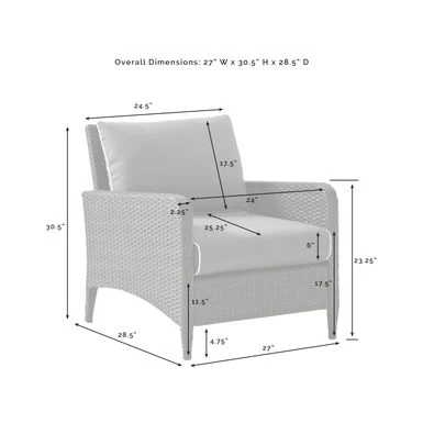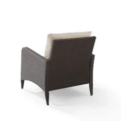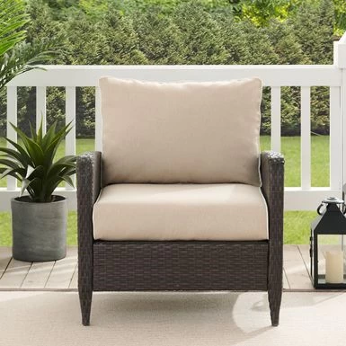 Sit back and relax in the comfortable Kiawah Outdoor Wicker Arm Chair. Crafted with elegant, all-weather resin wicker woven over a durable powder-coated steel frame and UV/fade resistant cushions, this outdoor arm chair is perfect for lounging and entertaining. With its plush piped cushions, deep seats, and stylish design, it’s a sophisticated addition to any outdoor setting.