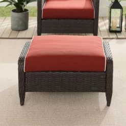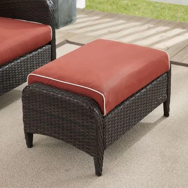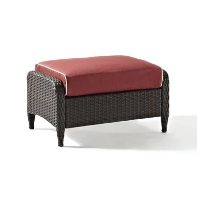 Get ready to unwind and elevate your outdoor relaxation game with the Kiawah Outdoor Wicker Ottoman. Its stylish design and plush piped cushion make it the perfect companion to any outdoor seating arrangement. Featuring all-weather wicker that is elegantly woven and UV-resistant, this ottoman is built to last. The durable powder-coated steel frame ensures sturdiness, while the sangria-colored cushion covers with white piping and moisture-resistant high-grade cushion cores provide ultimate comfort.