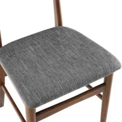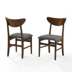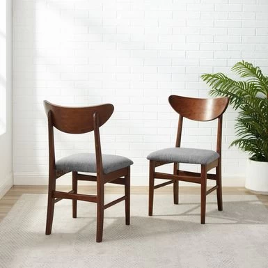 Chic and stylish, Landon Wood Dining Chairs evoke a simplicity of years gone by. With tapered legs and a distinctive mid-century modern back, this dining chair is classic yet fashionable. Chic and stylish, Landon Wood Dining Chairs evoke a simplicity of years gone by. With tapered legs and a distinctive mid-century modern back, this dining chair is classic yet fashionable. Featuring an upholstered seat for comfort, the Landon Dining Chair will create a casual and inviting atmosphere in your kitchen or dining room. – Mid-century modern design – Mahogany finish – Modern style wood back – Seat upholstered in gray fabric – Tapered legs – Pairs well with modern, farmhouse, and rustic decor