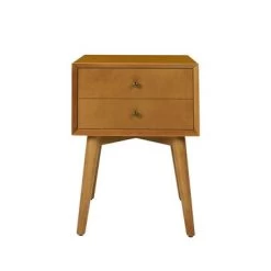 Upgrade your bedroom with the Landon nightstand in acorn finish. This mid-century inspired piece features a pullout drawer with genuine metal hardware for a vintage feel. The sturdy frame construction and streamlined style make it a perfect addition to any home.