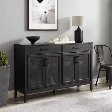 The Milo Sideboard is a versatile furniture piece that complements various home styles. With a simple yet unique design, this sideboard features large cabinet doors with beautiful poly-rattan mesh panels that conceal adjustable and removable shelves. It also has two full-extension drawers on ball-bearing glides, genuine metal hardware in a black finish, and two perforated cable management holes for a tidy setup. This multipurpose sideboard can be used as a traditional sideboard, credenza, or TV stand, and fits most TVs up to 65″. Its sideboard top has a weight limit of 100lbs.