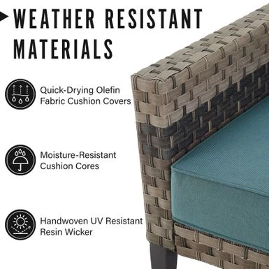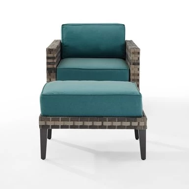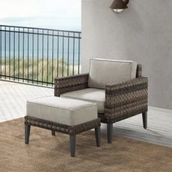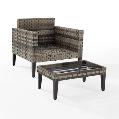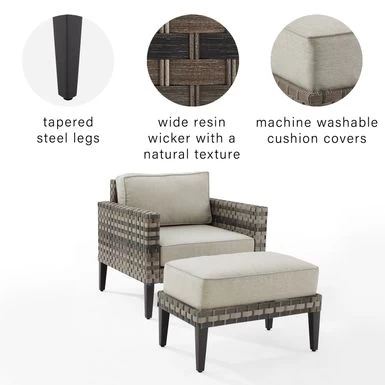 Step up your outdoor seating game with the Prescott 2Pc Outdoor Wicker Armchair Set. This set consists of a modern armchair and ottoman, both handwoven with multi-tone, weather-resistant resin wicker over a powder-coated steel frame. High grade cushion cores with quick-drying olefin fabric covers provide a comfortable seating experience for up to two people, and removable covers are easily machine washable. With adjustable levelers and steel tapered legs in a dark brown finish, you’ll love lounging in the sun with this luxurious outdoor seating set.