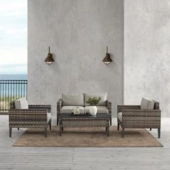Create an outdoor oasis with the Prescott 4Pc Conversation Set. Resistant to the elements, this set includes a loveseat, armchairs, and coffee table crafted from all-weather resin wicker handwoven over powder-coated steel frames. The slatted steel top of the coffee table offers durability and provides a perfect spot for refreshments. Deep moisture-resistant cushions, in mineral blue and taupe covers, complete the look of the set. Relax and enjoy the sun in style and comfort.