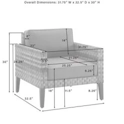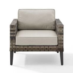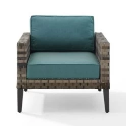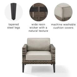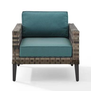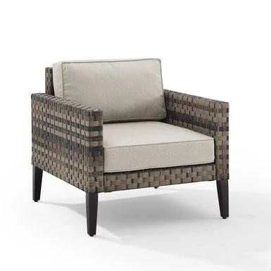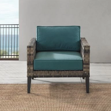 Offering a modern take on classic wicker, the Prescott Armchair is a great addition to your at-home retreat. Resistant to the whims of mother nature, this chair features all-weather resin wicker woven over a powder-coated steel frame. Offering a modern take on classic wicker, the Prescott Armchair is a great addition to your at-home retreat. Resistant to the whims of mother nature, this chair features all-weather resin wicker woven over a powder-coated steel frame. The wide wicker is beautifully weathered and has the textured feel of natural fiber. Topped with deep, moisture-resistant cushions, the Prescott Armchair will be your favorite place to relax in the sun.Features:Modern designUV resistant all-weather flat wide resin wickerWeather-resistant powder-coated steel frameHandwoven multi-tone brown resin wicker with a weathered natural textureDue to the multi-tone wicker, color variation among pieces should be expected, and enhances the character of the productMineral blue cushion coversTaupe cushion coversQuick-drying olefin fabric cushion covers resist mildew and sun fadeMoisture-resistant high grade cushion coresRemovable cushion covers are machine washableSteel tapered legs in a dark brown finishAdjustable levelers on legs