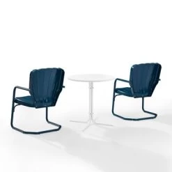 Bring classic charm and comfort to your outdoor space with the Ridgeland 3Pc Outdoor Bistro Set. This set includes two vintage-style chairs in vibrant colors and a metal bistro table for an enjoyable lounging experience. Crafted from sturdy steel and featuring a non-toxic powder-coated finish, this set is ideal for small balconies or patios. The chairs feature clamshell backs with decorative grooves and a cantilever base for flexible comfort, while the table features a pedestal base.