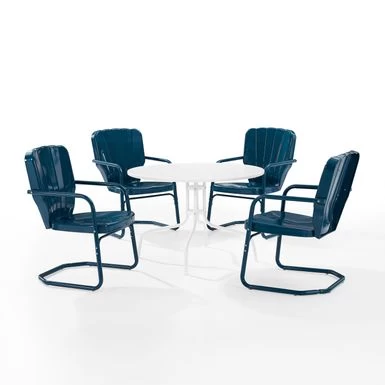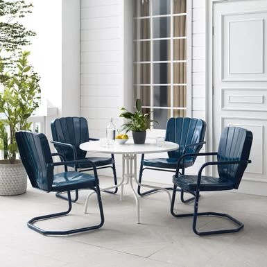 Elevate your outdoor dining area with the Ridgeland 5-piece Outdoor Dining Set. This fun and functional set includes a simple metal dining table with a white satin finish and four vintage styled chairs in vibrant colors. Each chair features a clamshell back with decorative grooves for added visual interest. The set is also UV resistant, ensuring its durability against the elements.