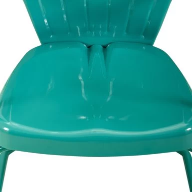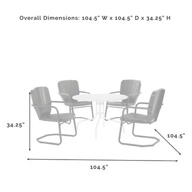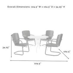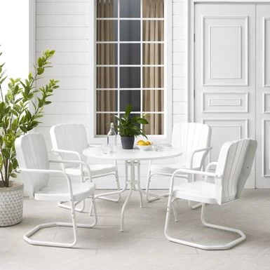 Elevate your outdoor dining area with the Ridgeland 5-piece Outdoor Dining Set. This fun and functional set includes a simple metal dining table with a white satin finish and four vintage styled chairs in vibrant colors. Each chair features a clamshell back with decorative grooves for added visual interest. The set is also UV resistant, ensuring its durability against the elements.