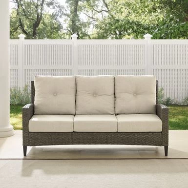 Add a classic look to your home with this outdoor wicker high back sofa. With a high back and gently arched arms, this sofa is built from all-weather resin wicker handwoven over a powder-coated steel frame. Plush seat and back cushions covered in olefin fabric offer durable comfort, while the unique tapered legs are made of sturdy steel that is hand-painted to look like real wood.Â