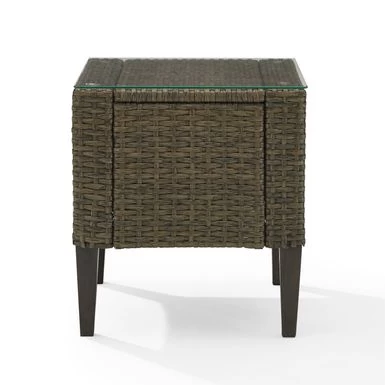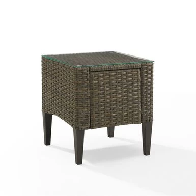 Crafted with traditional design and all-weather resin wicker, the Rockport Outdoor Wicker Side Table lends a timeless touch to your outdoor area. This stylish piece features a powder-coated steel frame handwoven with light brown resin wicker, steel tapered legs hand-painted to look like real wood, and a tempered glass tabletop for a touch of sophistication. The adjustable levelers on the legs and a weight limit of 100lbs make this side table a reliable and stylish addition to any outdoor space.