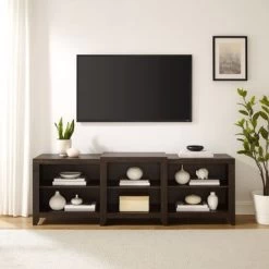 Upgrade your home entertainment experience with the Ronin 69″ TV Stand, perfect for TVs up to 75″. With a sleek low-profile design and tapered legs, this TV stand offers three open cabinets with adjustable shelving to accommodate all your media accessories. Cable management is made easy with pre-cut holes at the back. The Ronin TV Stand is a stylish addition to any living room, blending well with farmhouse, traditional, and mid-century modern décor.