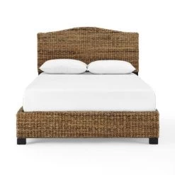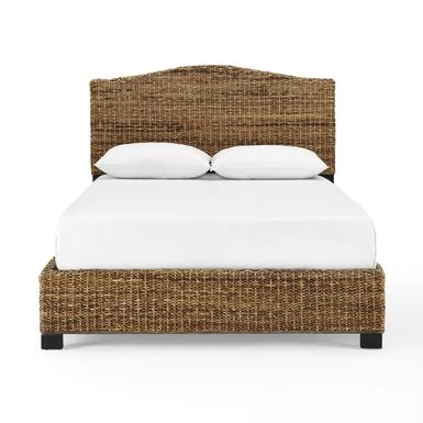 Be ready to relax with the comfy, coastal vibe of the Serena Queen Bed. Featuring a natural banana leaf weave, this bed adds warmth and texture to any bedroom space. Be ready to relax with the comfy, coastal vibe of the Serena Queen Bed. Featuring a natural banana leaf weave, this bed adds warmth and texture to any bedroom space. The Serena Queen Bed will look great piled high with plush linens, creating an inviting bedroom oasis. – Coastal design – Natural finish – Banana leaf weave over steel frame – Feet are finished in matte black – Low profile footboard – Arched headboard – Pairs well with coastal and rustic decor – Mattress and box spring not included