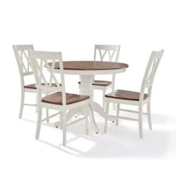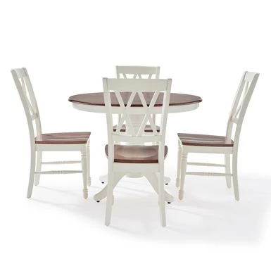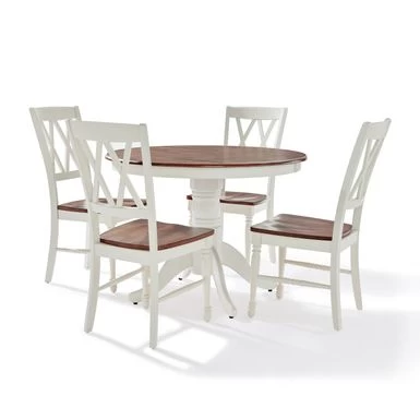 Gather your family for a delightful meal around the Shelby 5Pc Round Dining Set. With a classic turned pedestal and legs, this dining set merges tradition with modern farmhouse decor. The table features a rich cherry finish tabletop with a soft beveled edge and generous apron that complements the rubbed white finish. The open double x-back chairs provide comfortable seating for four, making it an ideal fit for an eat-in kitchen or dining room.