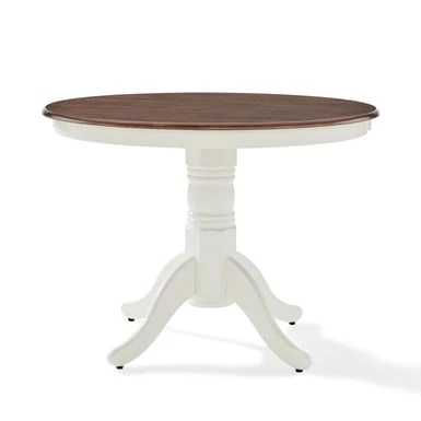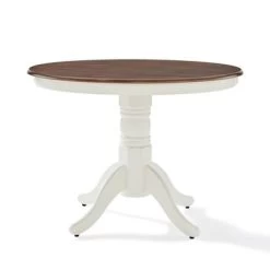 Upgrade your dining space with the Shelby Round Dining Table. This table boasts a classic design with a turned pedestal base, making it a perfect fit for any farmhouse or traditional decor. The table features a rubbed white finish with a rich cherry tabletop, soft beveled edges, and a generous apron. Seating up to four diners, this table is perfect for family meals and entertaining guests.