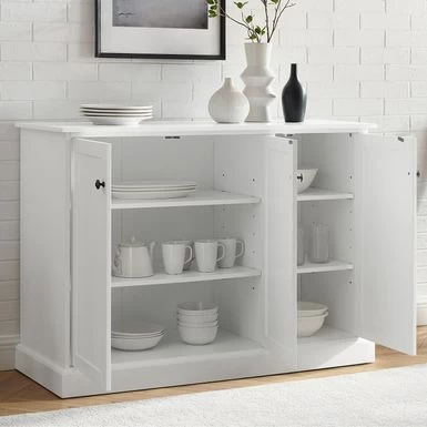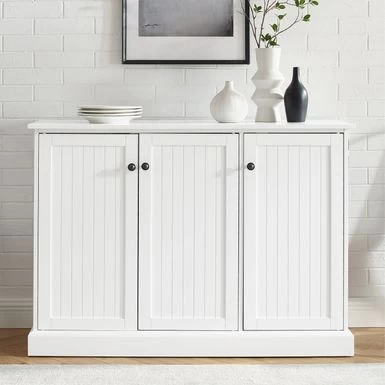 Featuring charming beadboard details, the Shoreline Sideboard adds a dash of coastal flair to your dining room or kitchen. This sideboard has a large top for serving and a dual cabinet design for ample storage. Featuring charming beadboard details, the Shoreline Sideboard adds a dash of coastal flair to your dining room or kitchen. This sideboard has a large top for serving and a dual cabinet design for ample storage. Add the Shoreline Sideboard to any room of your home and get organized in style.Features:Coastal designWhite finishGenuine metal hardware with a bronze finishBeadboard paneling on doorsCabinet doors have magnetic closuresTwo adjustable and removable shelves in each cabinet with a 15lb weight limit per shelfPairs well with traditional and farmhouse decorSideboard top weight limit is 100lbs