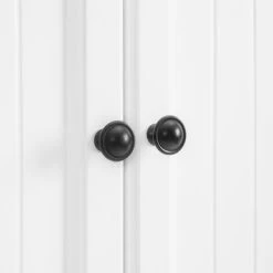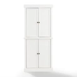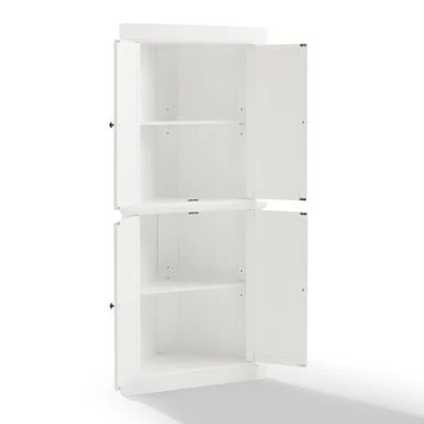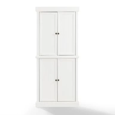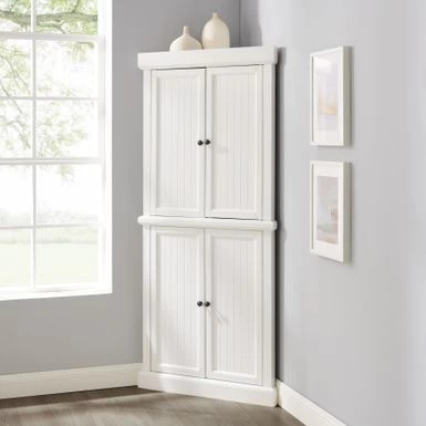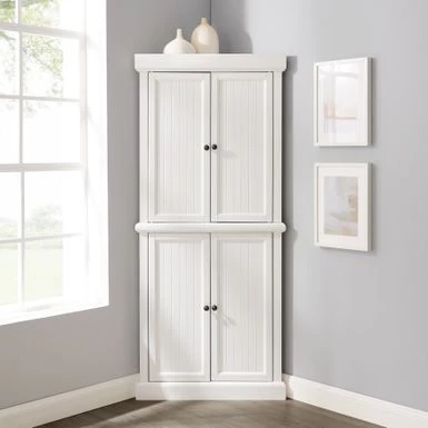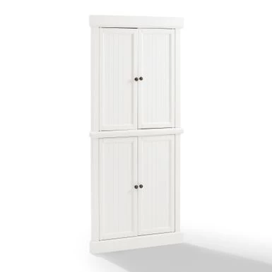 With charming beadboard details, the Shoreline Pantry provides a dash of coastal flair to home organization. With charming beadboard details, the Shoreline Pantry provides a dash of coastal flair to home organization. Comprised of two identical stackable pantries, this set is connected with a sturdy metal plate, offering ample storage without taking up valuable floor space. Ideal for smaller rooms, the Shoreline Tall Corner Pantry offers adjustable shelving and is designed to tuck neatly into any corner of the home.Features:Coastal designWhite finishGenuine metal hardware with a bronze finishBeadboard paneling on doorsCabinet doors have magnetic closuresEach cabinet has an adjustable and removable shelf with a 15lb weight limit per shelfIncludes metal plate for stacking two units togetherCan be used in a bathroom, home office, or kitchenPairs well with traditional and farmhouse decor